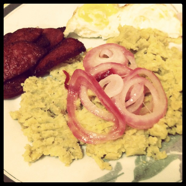 MANGU! The very word makes me and countless other Quisqueyanos salivate. For those that don’t know, mangu is the Dominican breakfast par excellence. Mangu is basically boiled, mashed green plantains with olive oil and a few others ingredients but that description doesn’t properly convey the magic of this staple of Dominican cuisine. Pair the mangu with fried cheese, eggs and Dominican Salami (AKA Los Tres Golpes) and you have a meal that is simple yet sublime. I would be remiss if I didn’t mention the vinegar soaked cooked onions that elevate the mangu to a work of gastronomic art.